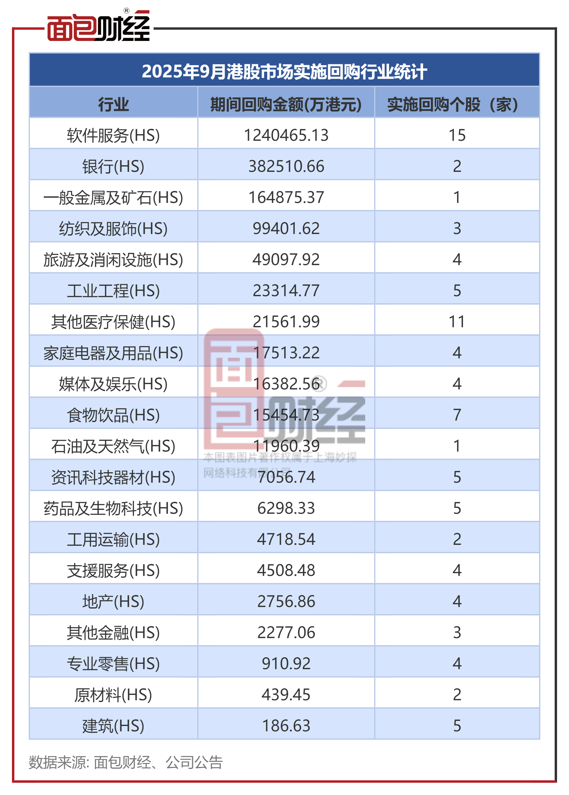 2025年9月发起回购的港股上市公司,主要分布在软件服务、其他医疗保健等行业。